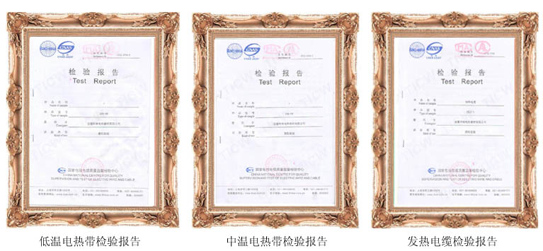 為了保證檢驗報告的權威性,時效性,針對性。我司電熱帶,發(fā)熱電纜產(chǎn)品選擇國家最權威的檢測機構-國家電線電纜質(zhì)量檢測中心進行送檢。經(jīng)過三四個月的檢驗周期,目前我司已重新獲得低中溫自控溫電熱帶,發(fā)熱電纜國家電線電纜檢驗報告。所以產(chǎn)品質(zhì)量均達到或優(yōu)于檢測標準,這是對我司近期生產(chǎn)的產(chǎn)品質(zhì)量,包括原材料采購一重要評定。我司將陸續(xù)更新現(xiàn)有公司資質(zhì),做到與時俱進。