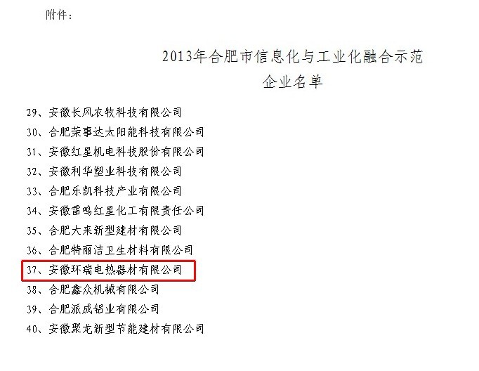 為加快推進我市兩化深度融合,發(fā)揮典型示范作用,依據(jù)《合肥市信息化與工業(yè)化融合示范企業(yè)認定管理辦法(試行)》和《合肥市第三方企業(yè)信息化公共服務平臺認定辦法(試行)》等文件,經(jīng)企業(yè)申報、縣區(qū)推薦、專家評審和綜合審查,現(xiàn)確定安徽環(huán)瑞電熱器材有限公司,等40家為2013年合肥市 安徽環(huán)瑞將積極響應政府的有關倡導:不斷提升自身信息化應用水平,切實發(fā)揮示范企業(yè)帶動作用,認真總結信息化建設經(jīng)驗,積極探索利用信息技術推動產(chǎn)業(yè)升級轉(zhuǎn)型,發(fā)展新型業(yè)務模式,培育新業(yè)態(tài),走出一條合肥特色的信息化與工業(yè)化深度融合的“科技環(huán)瑞”的發(fā)展道路,促進電伴熱帶,發(fā)熱電纜產(chǎn)業(yè)結構優(yōu)化升級,最終為振奮合肥的經(jīng)濟,做出貢獻!