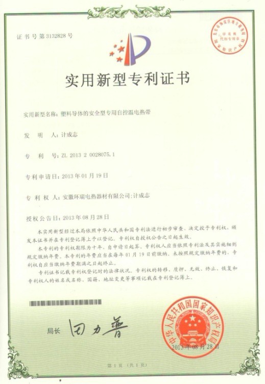 環(huán)瑞自成立研發(fā)小組至科學技術中心期間,通過獨立開發(fā),與合肥工業(yè)大學建立長期合作關系,聘請相關專業(yè)的技術專家等模式,投入大量的人力物力。我司以安全,實用性能為目標,對電伴熱帶結構、原材料、生產工藝進行創(chuàng)新,最新研發(fā)的“三層共擠自控溫電伴熱帶”“ 塑料導體的安全型自控溫電熱帶”獲得了2項國家專利證書。我司已獲得了5項關于自限溫伴熱帶的國家專利證書,我司伴熱帶的生產技術已達到國內先進。共計19項專利。新的專利證書已下達。